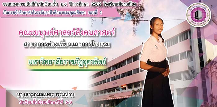 | ขอแสดงความยินดีกับนักเรียนชั้น ม.6/3 ปีการศึกษา 2562 กับการเข้าศึกษาต่อในระดับอาชีวศึกษาและอุดมศึกษา รอบที่ 1 |
