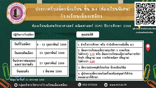 ประกาศผู้ชนะการยื่นซองประมูลร้านจำหน่ายอาหารภายในโรงเรียนเมืองเชลียง ปีการศึกษา 2569 02 มี.ค. 69